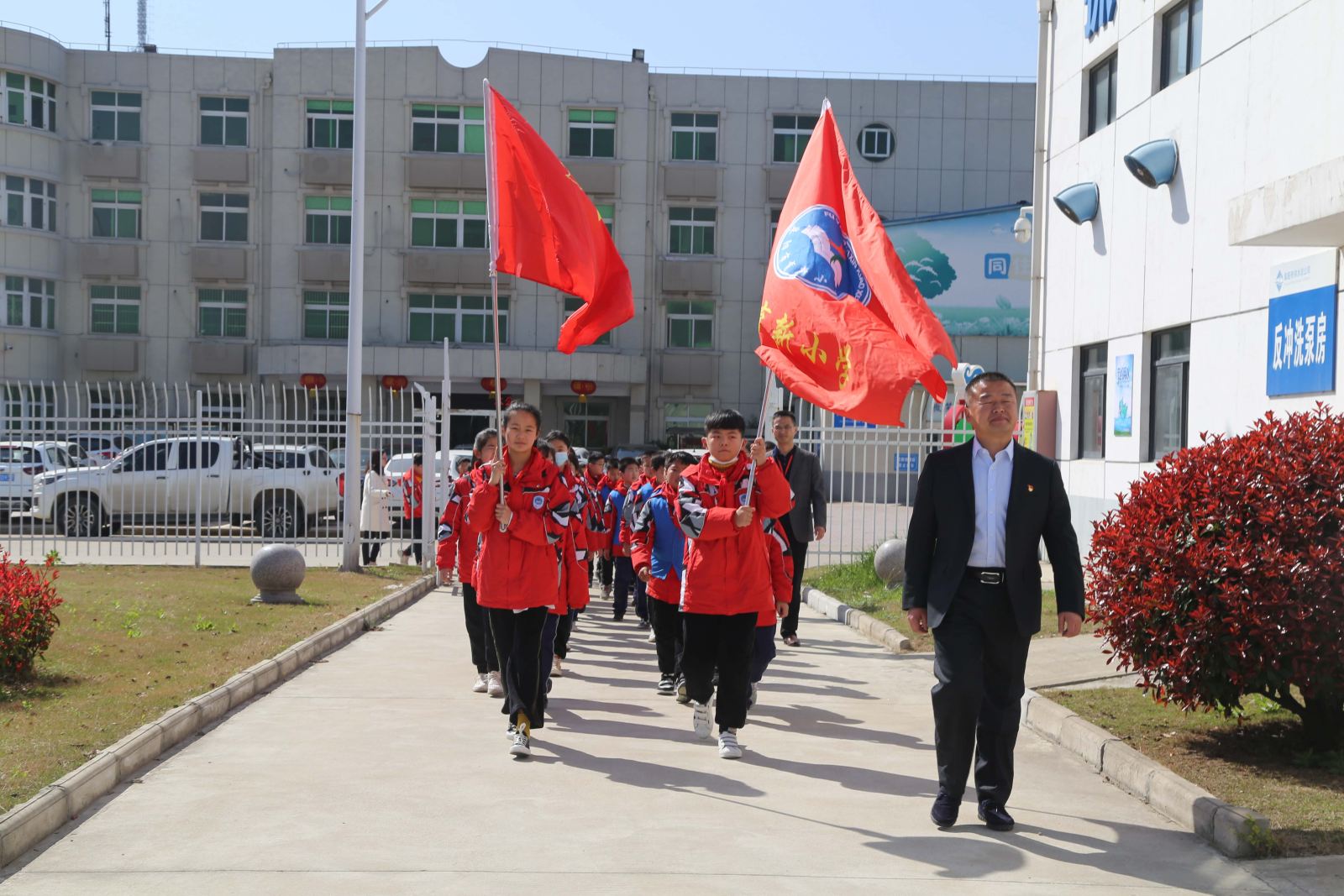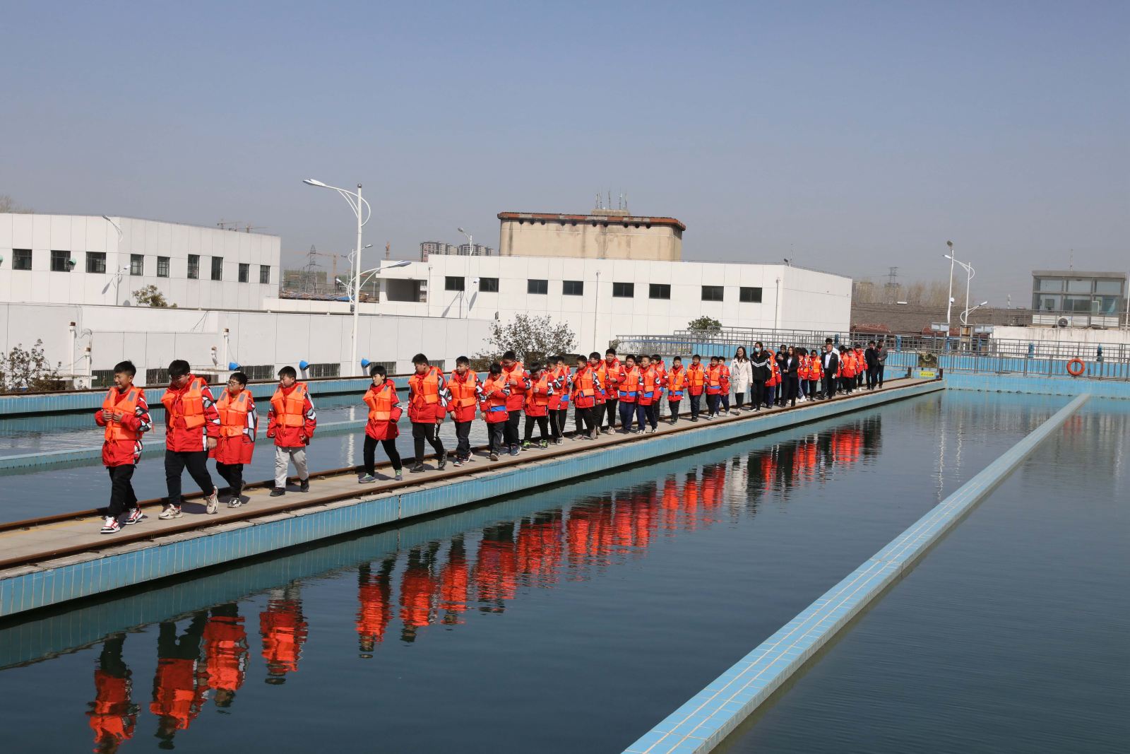 早上十點,育新小學老師們帶領孩子們整齊有序的在第二水廠門口集合。在工作人員簡單的介紹和做好自身防護后,由總公司黨委委員、生產運營部主任謝樹賢帶領孩子們先后參觀了二水廠內的反應沉淀池、濾池、清水池、加氯間、變電所、送水泵房等地。